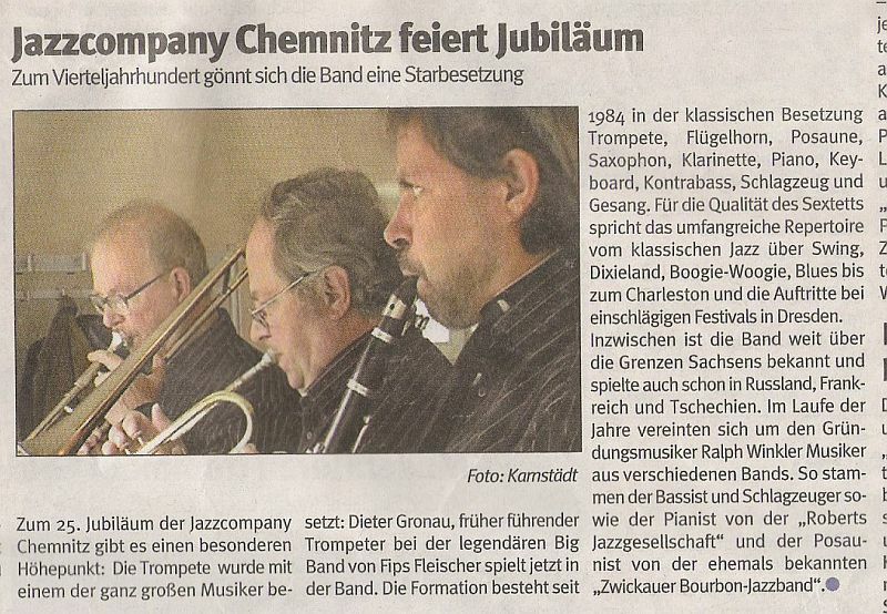 "Freie Presse Chemnitz" schreibt über die Company: "Humorvoll und gediegen. Auftritte zum internationalen Dixielandfestival in Dresden sprechen für die Qualität des Chemnitzer Sechstetts.